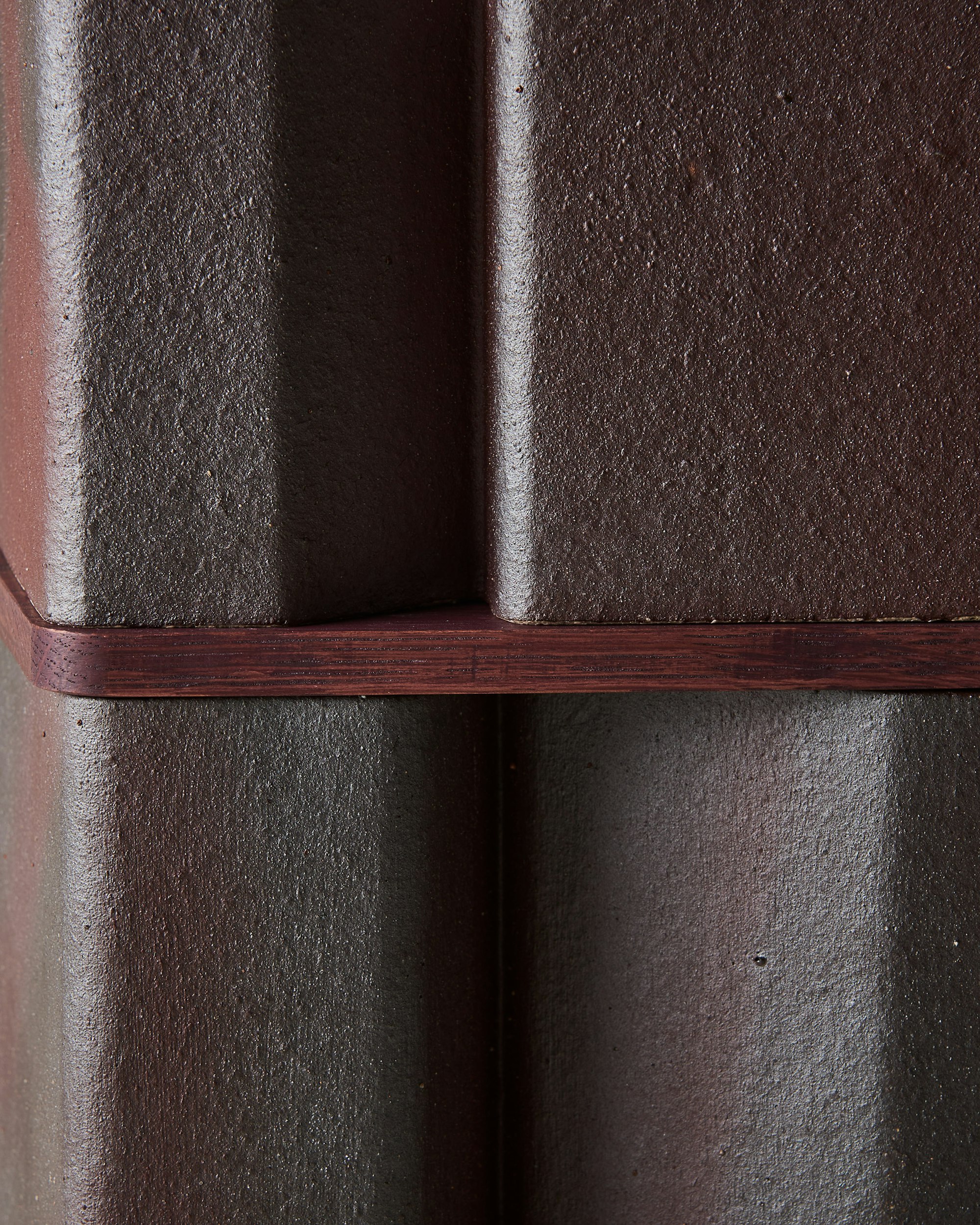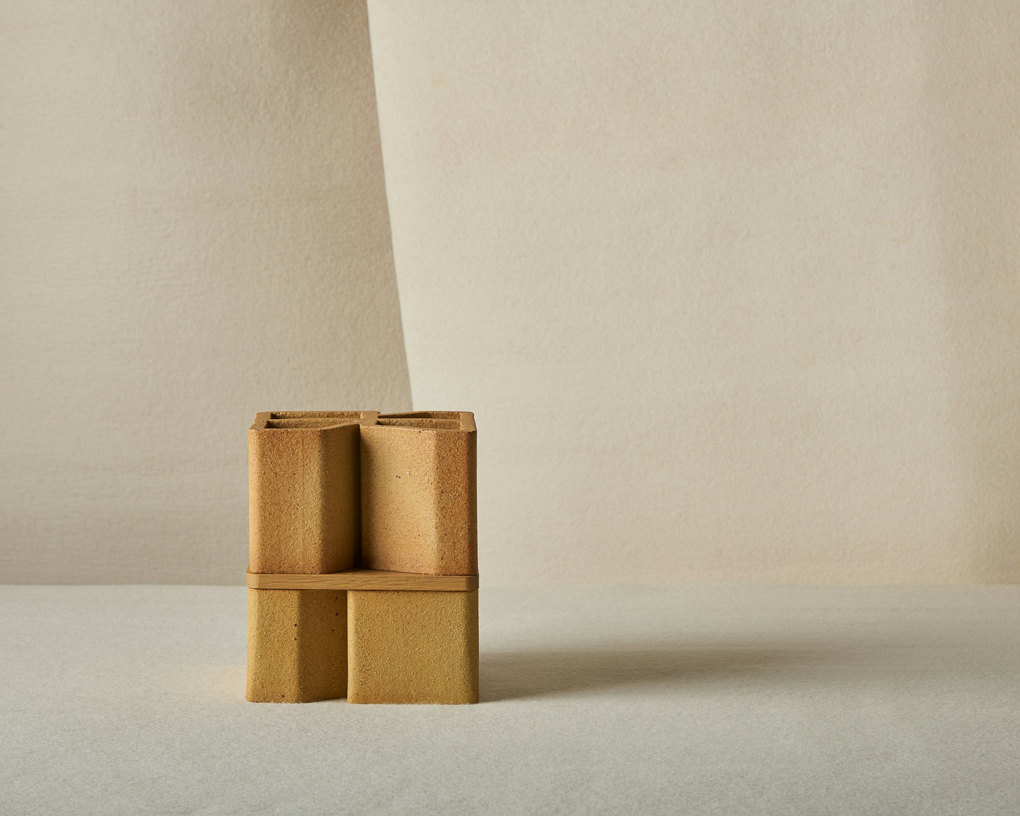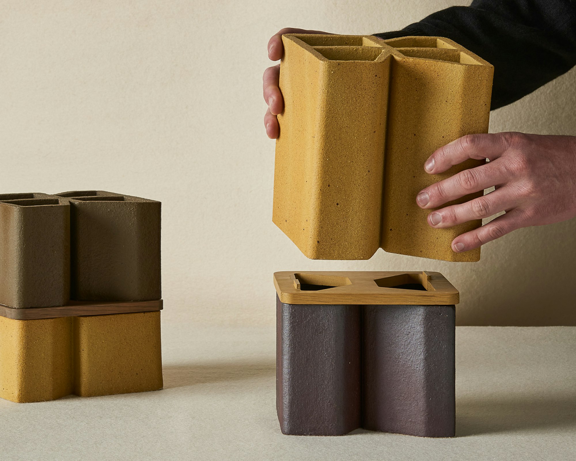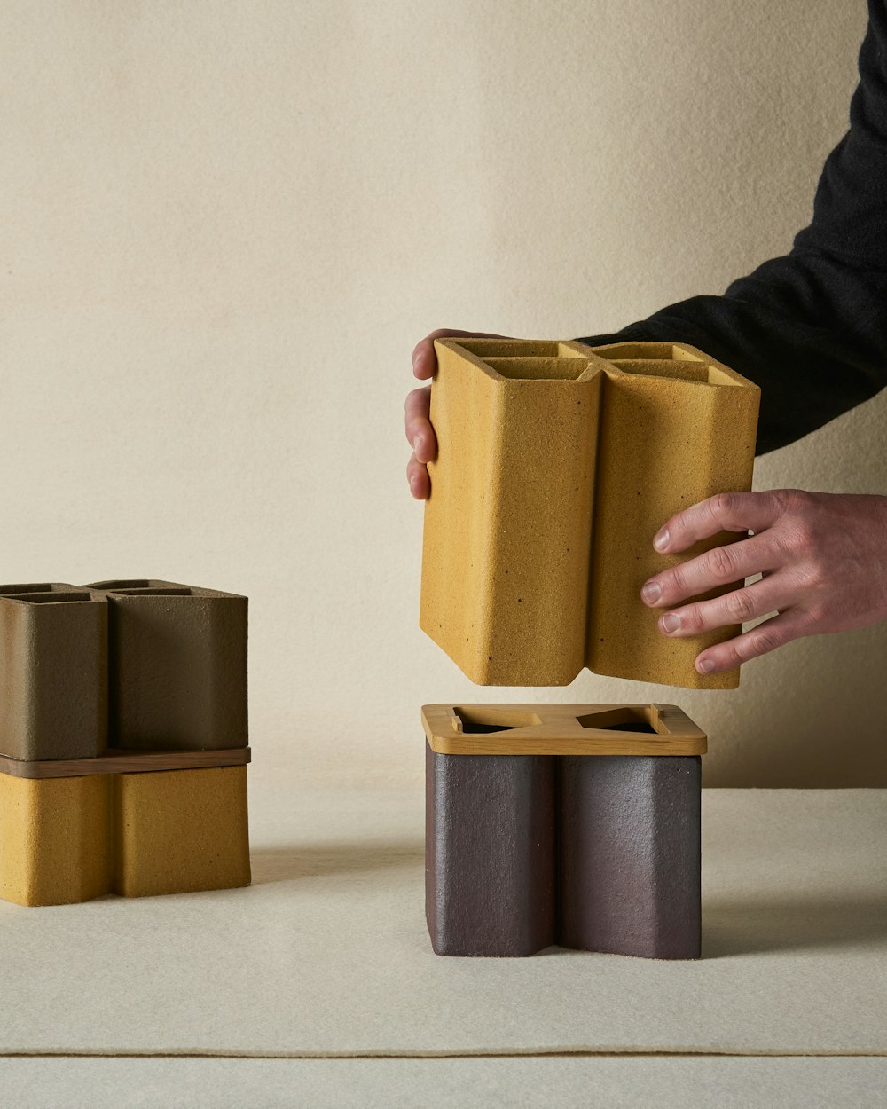 VAS is functional and imaginative. It can be stacked, rotated and arranged in multiple ways. The base is watertight and can be used functionally to arrange ‘things’ or imaginatively through experimenting with positioning the three interconnecting parts. They have been made using an engobed surface finish in three colours – Wattle, Banksia, and Iron Ore. The timber connector elements have been stained to complement the ceramic surfaces. The ceramic base and top elements are made in modular heights which, when stacked, result in vessels with four different overall heights.