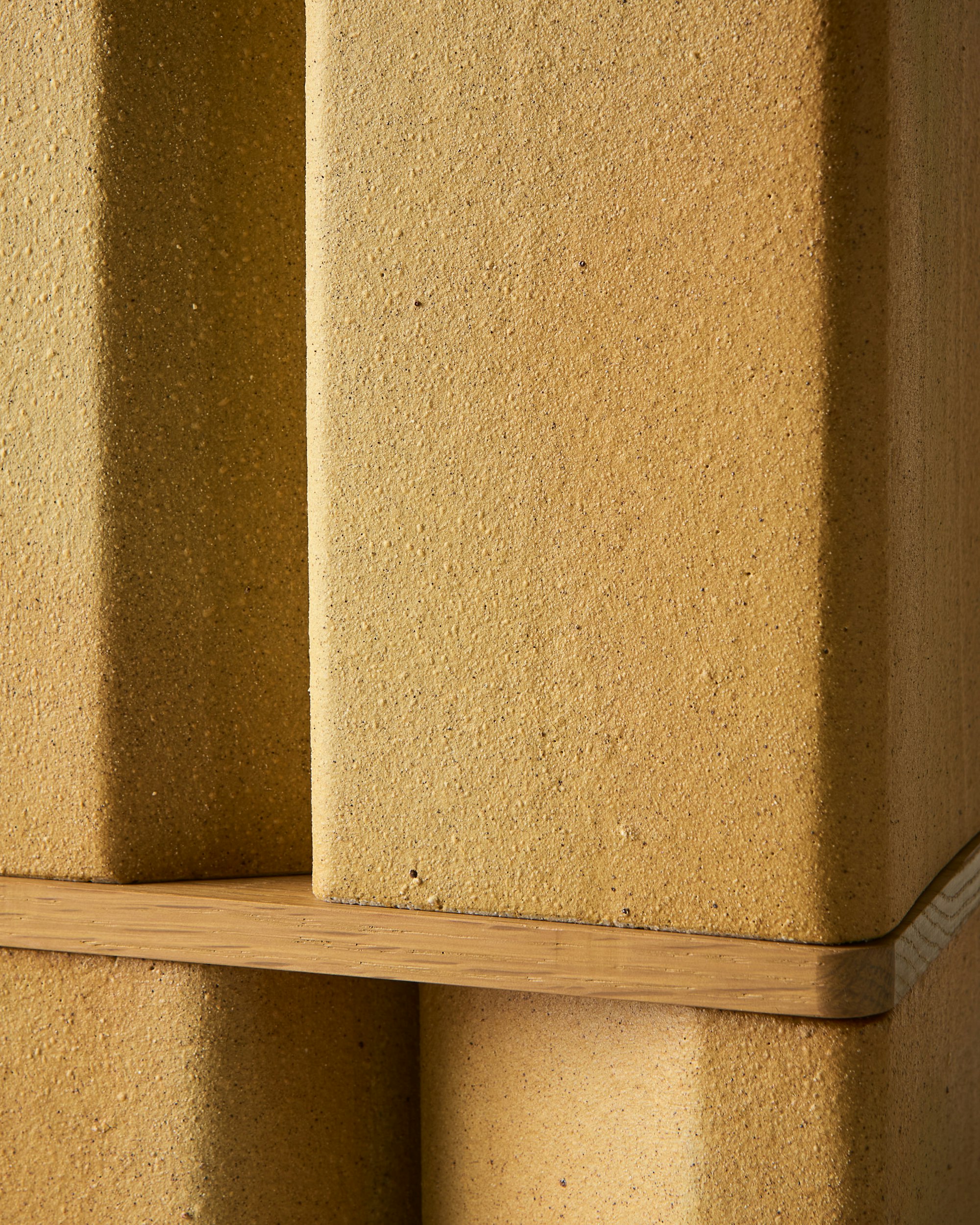 VAS is a vessel comprising three interconnecting parts – a base and a top that are made from fired ceramic, and a middle connecting element made from CNC cut reclaimed timber. A limited series of 48 vessels have been made, each a unique object by way of size, colour, and surface finish. VAS is an outcome of a process-based approach to research and making. The material used to make VAS would have otherwise ended up in landfill. It has gone through research and making processes to become a useable material that is able to be applied to studio designs.