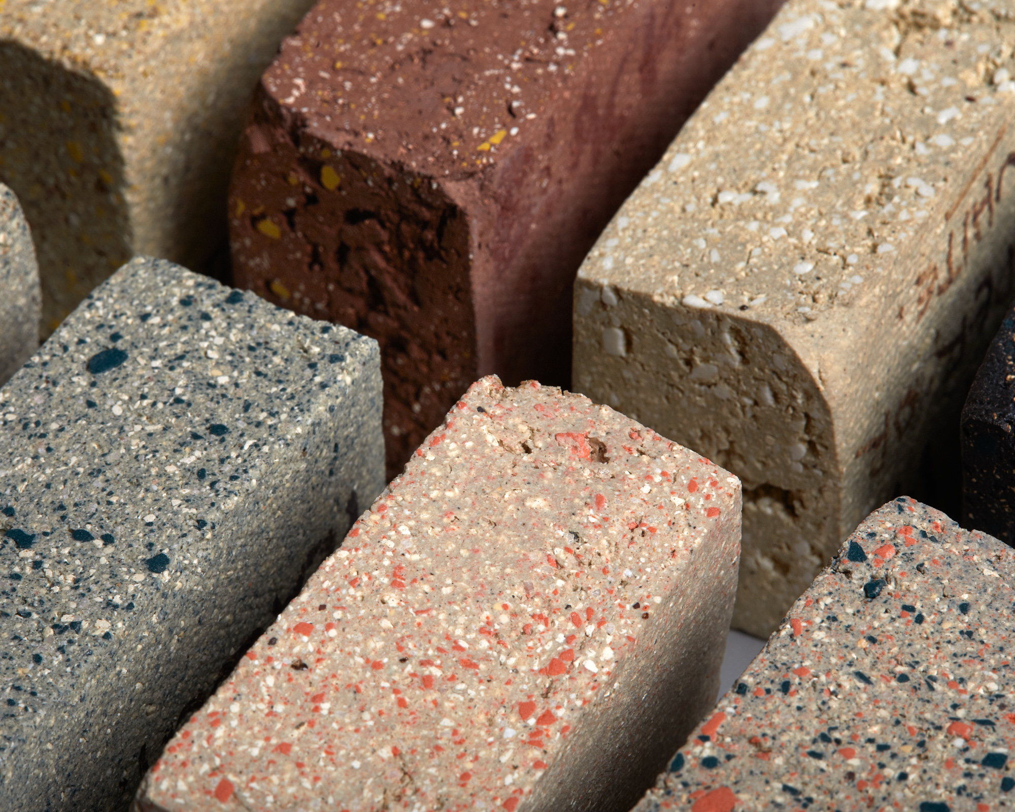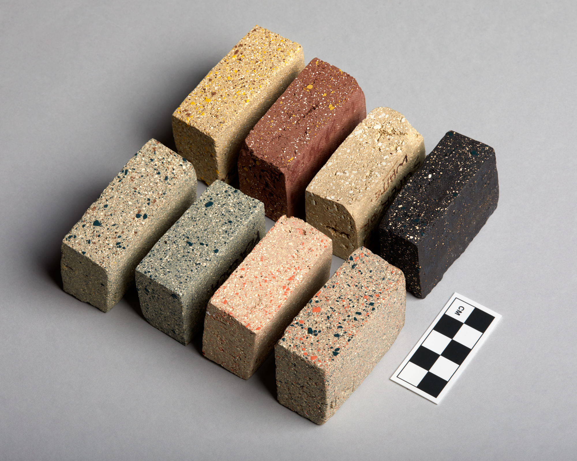 Following the explorations into waste additives, and the development of a process clay body from our internal waste streams, we started to look at the aesthetic possibilities of aggregates and additives in our clays. These studies use the studio process clay body as a base to create a coloured grog that can then be added to clay to produce a colourful effect in the clay itself.