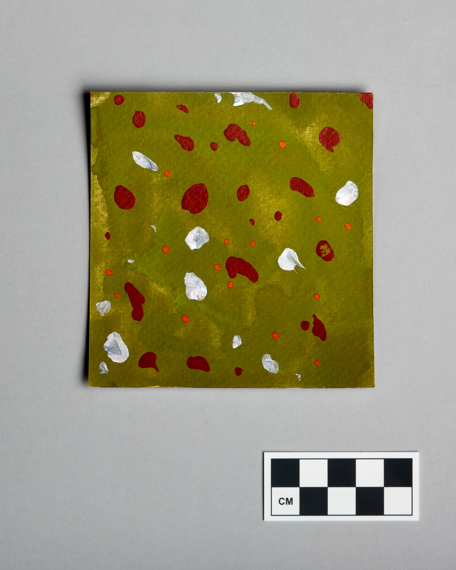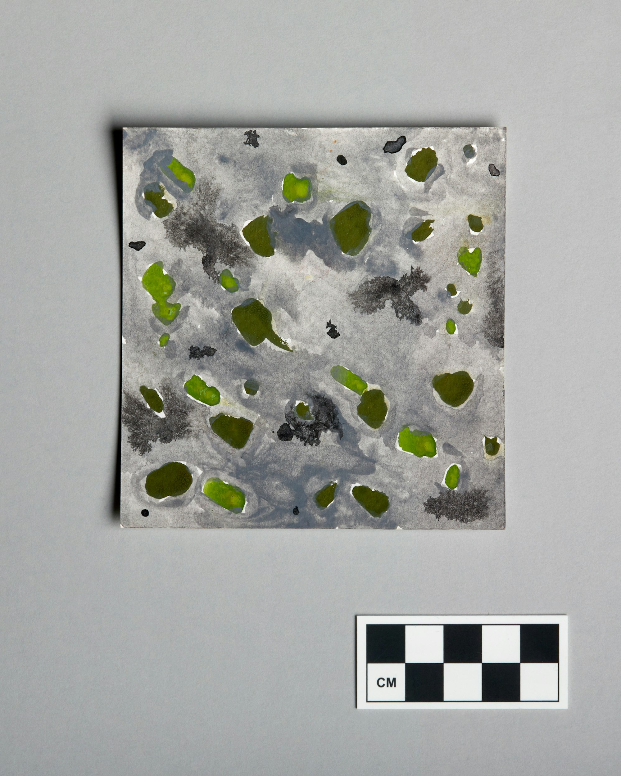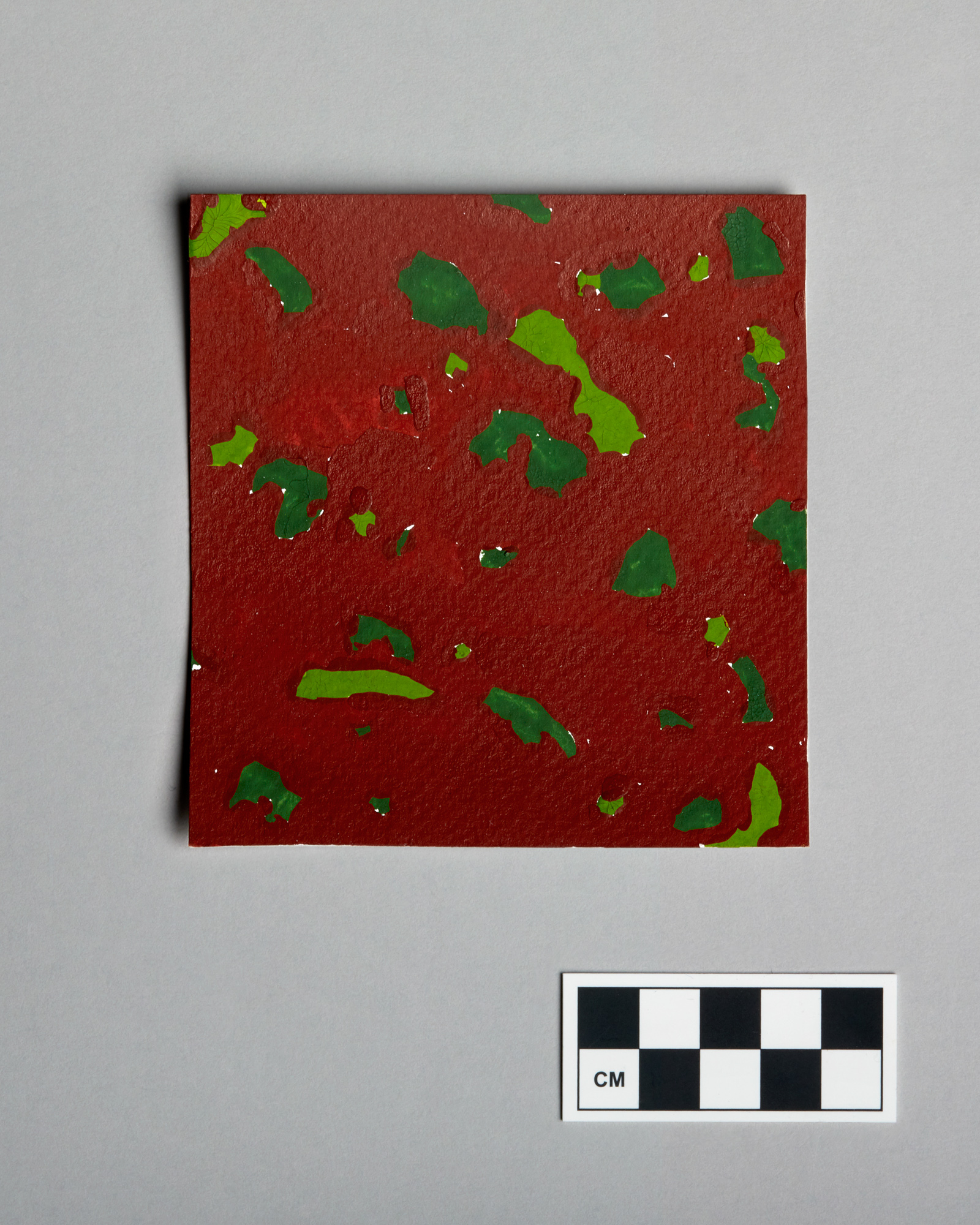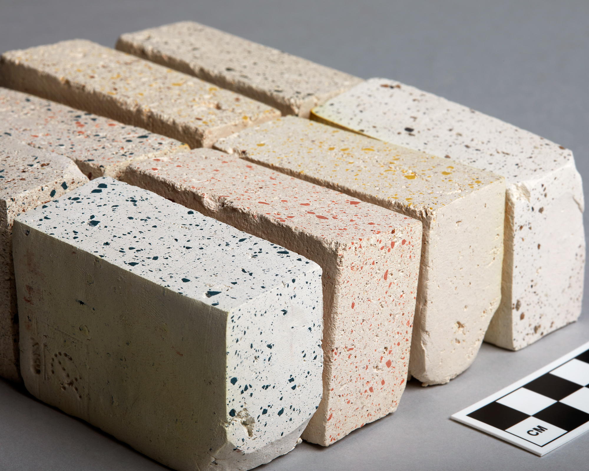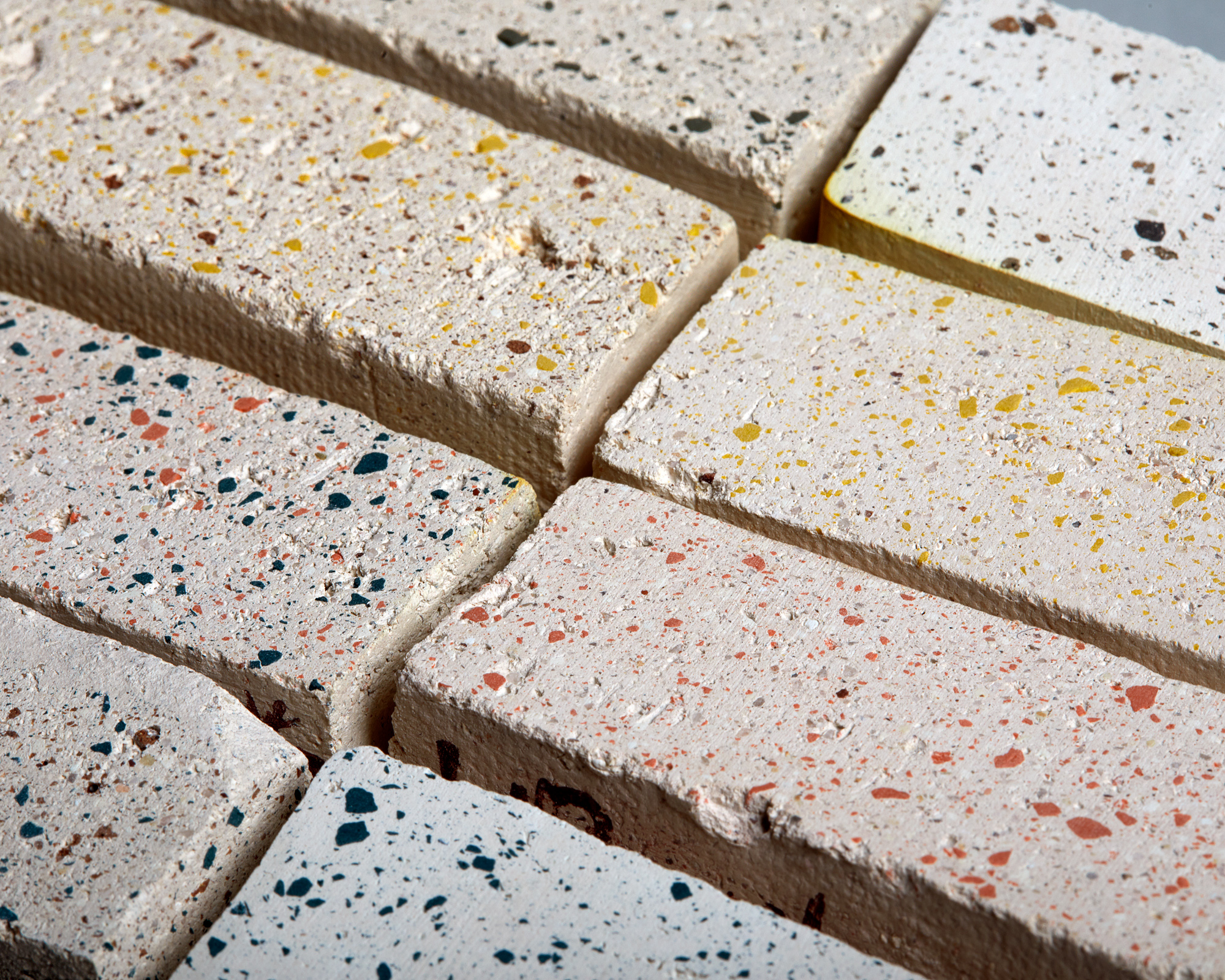 The development of a colour palette began with a series of studies painted based on observations of the local environment. These explorations generated the production of vibrant patterned test tiles which mixed coloured material with studio clay bodies. Test tiles produced using various mixtures of coloured grogs and fired to 1300˚C. The effect is intrinsically playful, bright flecks of stippled colour form a material that needs no glaze or further decoration.