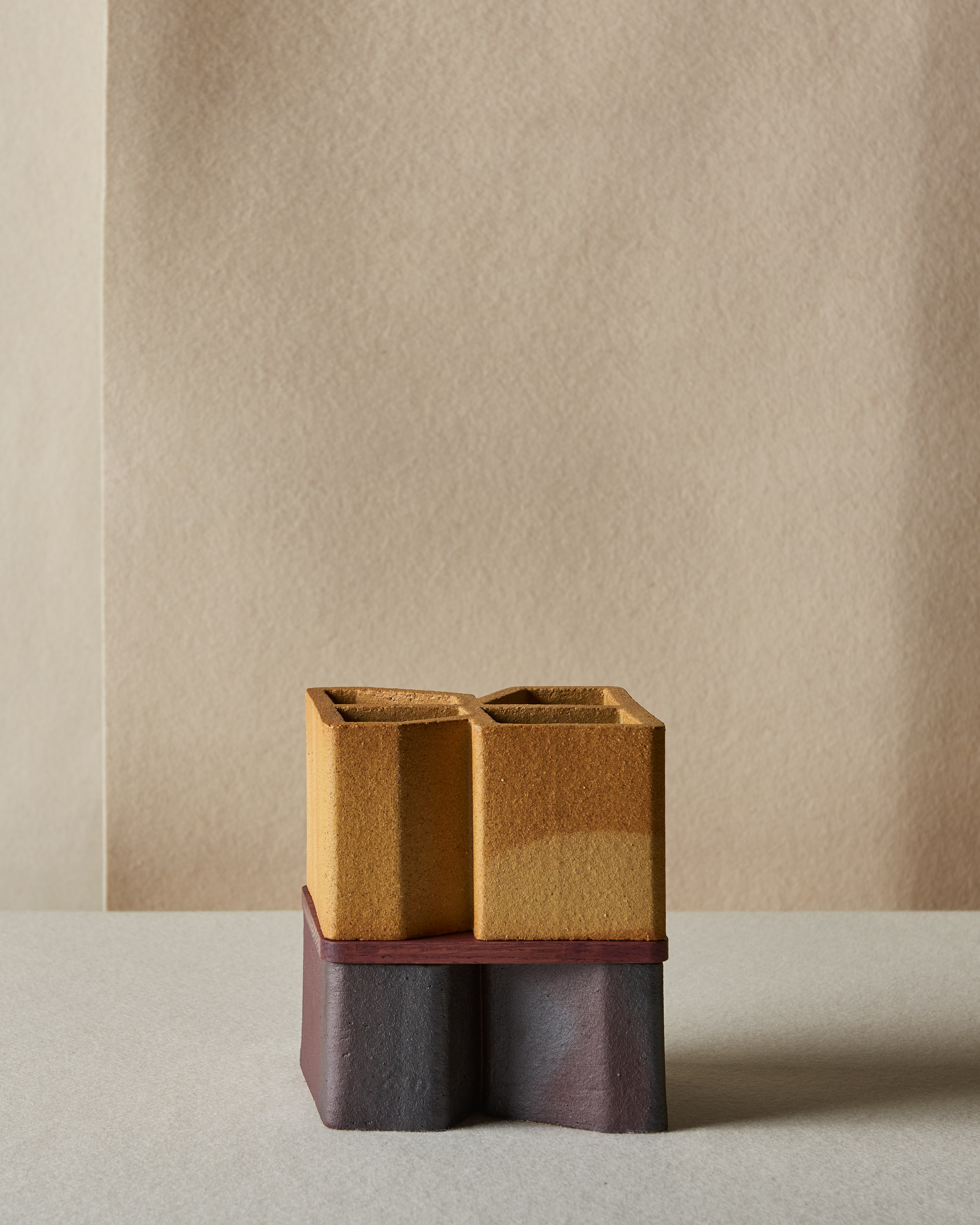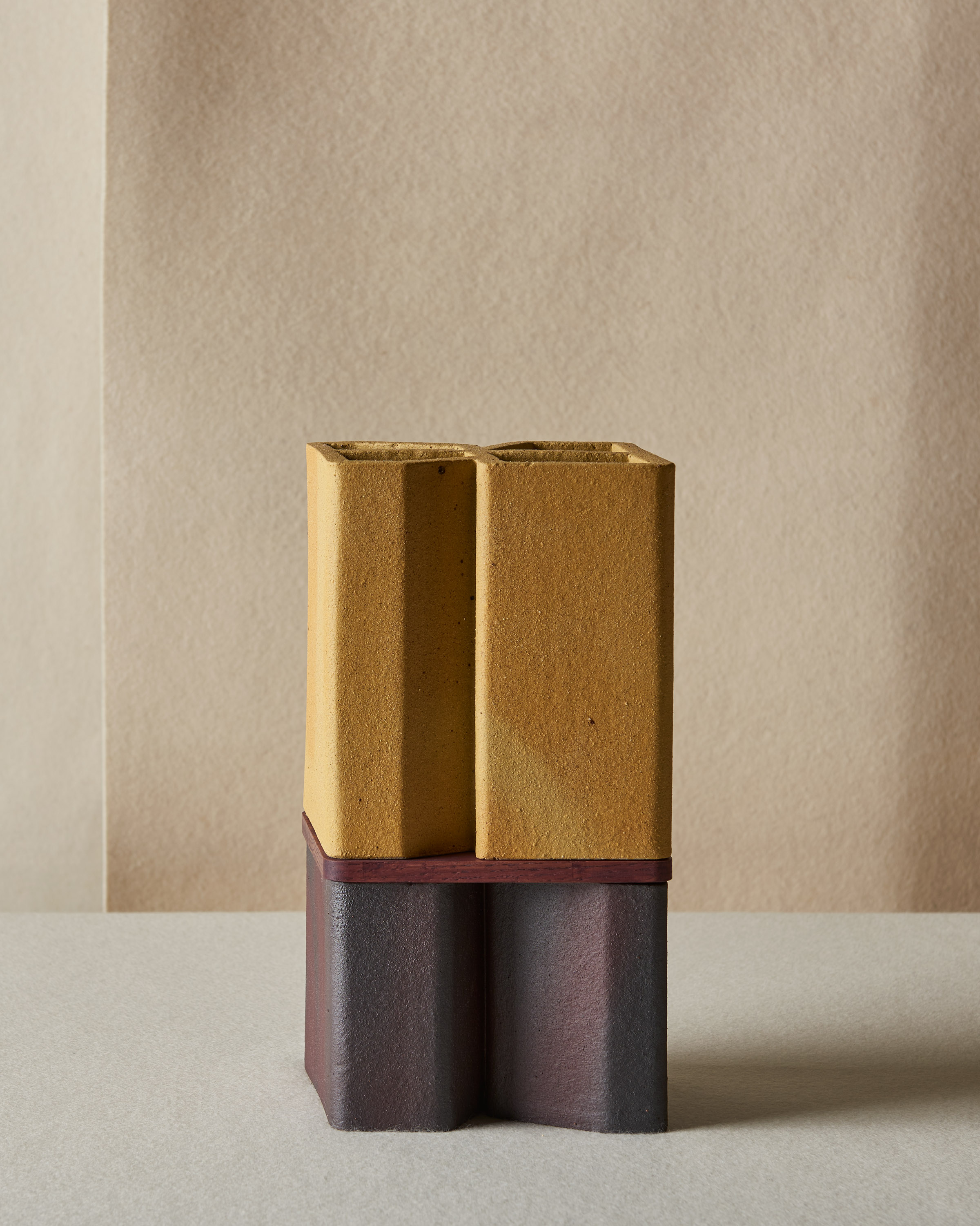 In an effort to repurpose as much material output as possible, we chose to utilise the extrusion process. Initial die tests revealed limits to the potential scale of the object before it began to slump. We modified the design, joining two forms into one with interior walls and a faceted form that provided additional strength. Large lengths were then extruded and cut to four heights to create the topology of VAS. The 80mm and 120mm cuts were joined with slabs to create watertight bases, and the 100mm and 180mm lengths were left open to connect through a timber insert to the base. With the added element of the three colourways, these create the open and modular vessel form of VAS. The insert introduced a new material quality to the project and cushioned the often-harsh aural friction of ceramic on ceramic.